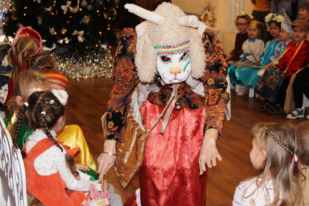 Гостей встречала сама Хозяйка с неутомимым Домовёнком Кузей — и поведали они ребятам, откуда пошёл обычай колядовать да добра желать. Явились следом к нам на праздник Дед-колядник, а с ним Коза-бодунья, пригожая да ладная! Кто рожком получил — тому удача на весь год. Кто погладил — все дела наладит! Но не успели мы и глазом моргнуть, как повеяло тайной да озорством: явились Баба-Яга с Чёртом! Завертелись, закружились,метлу пустили в пляс — но наша детвора только рассмеялась: не страшны ей сказочные проказники! А под занавес — во всей цыганской удали и широте души — появились Цыганка с Цыганом да учёный Медведь! Мишка и пел громогласно, и плясал до упаду, и даже«прихорашивался» — ну точь-в-точь красна девица у зеркала! Смеху-то было!