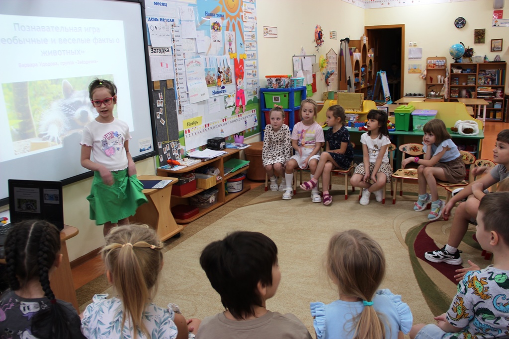 Наша воспитанница Удодова Варвара провела сначала с нашими ребятами, а затем и с детьми группы «Смешарики» увлекательную, развлекательно-познавательную игру «Интересные факты о животных».