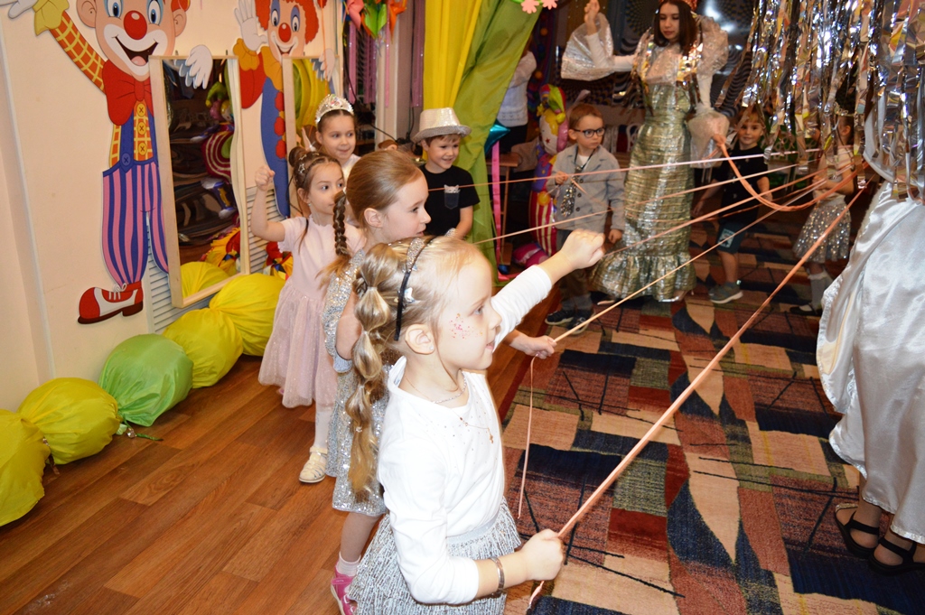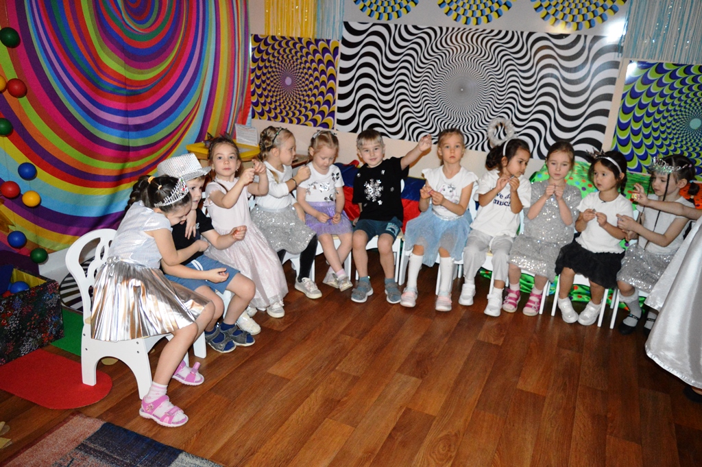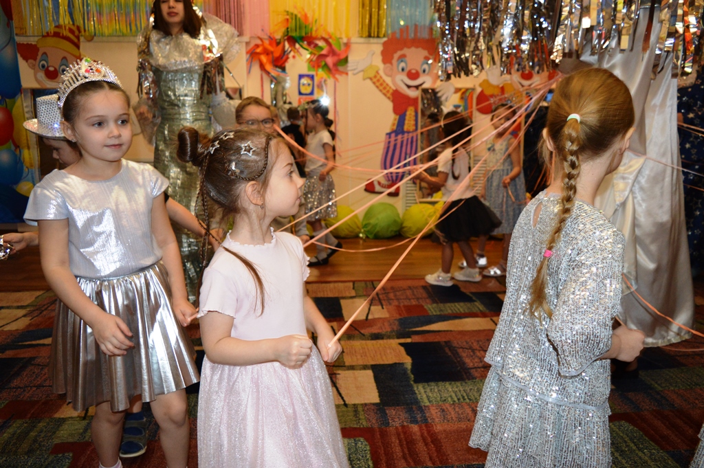 Зал преобразился до неузнаваемости: повсюду мерцали серебряные ленты, воздушные шары, искрились блестки, мигал яркими огоньками серебристый дискошар, создавая атмосферу волшебства и праздника. Дети, наряженные в свои лучшие серебряные наряды ,со стильными серебряными шляпами, коронами, ободками, с нетерпением ждали появления царственных особ. Сначала в гости пожаловала веселая искрометная Конфетка со своими конкурсами и заданиями.